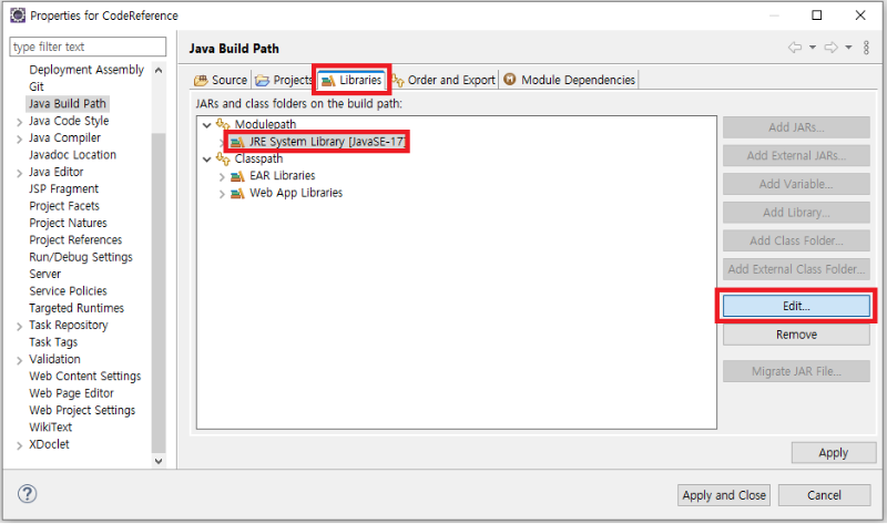 보통 각 프로젝트에 이클립스가 기본적으로 정해준 Java버전이 설정돼 있을 것이다. 컴퓨터에 설치돼 있는 Java 버전으로 수정할 예정이다. [자바 설치 방법]