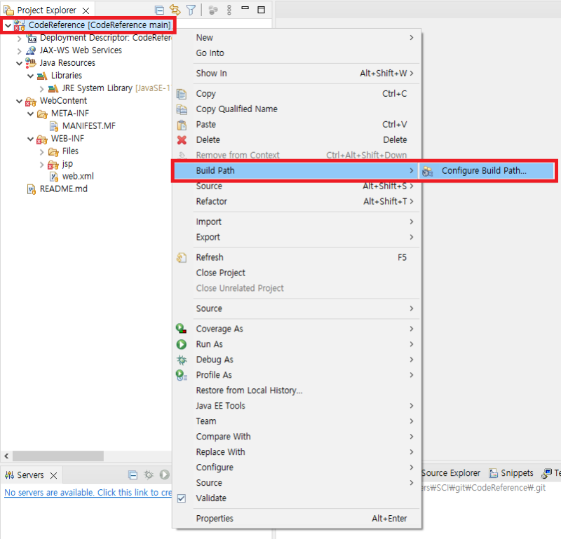 JRE System 및 Server Runtime 설정이 위와 같이 돼 있는지 확인.