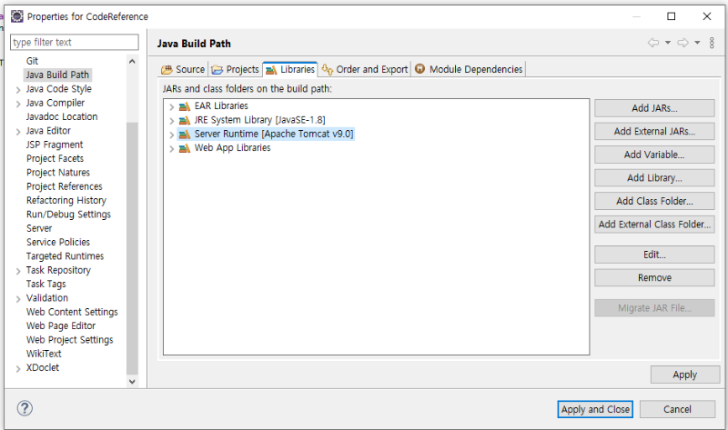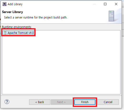 JRE System 및 Server Runtime 설정이 위와 같이 돼 있는지 확인.
