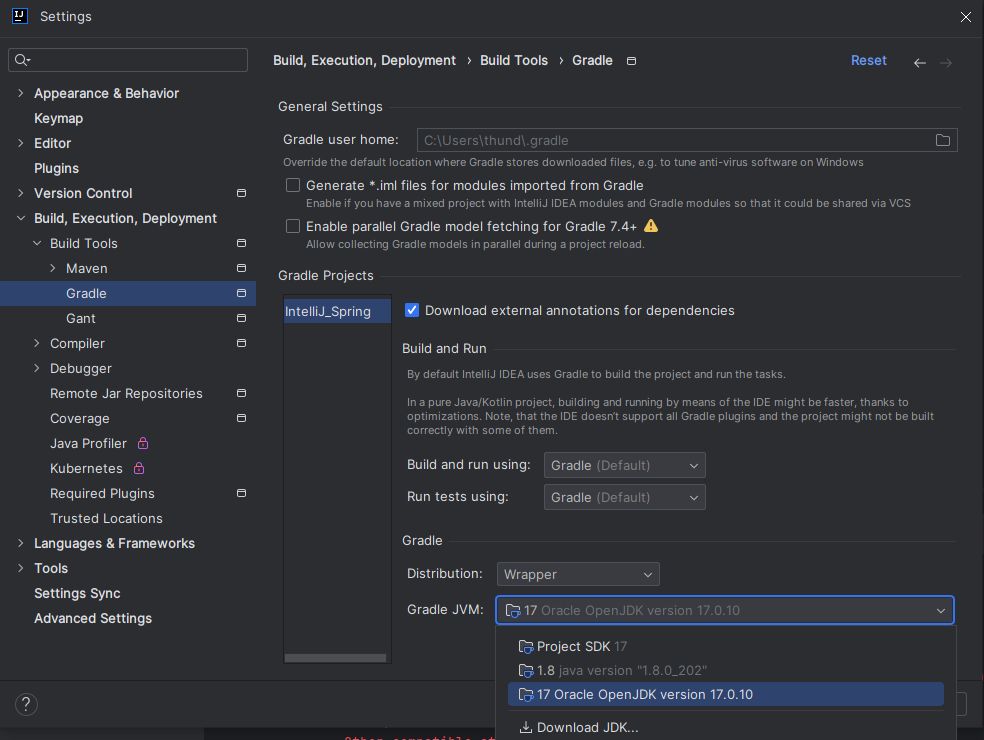 필자의 경우 IntelliJ를 새로 설치한 환경에서 Java1.8이 자동 인식 되어 프로젝트 Build때 사용했던 Java17 설정이 아니었다. 그럼으로 수동 바꾸어 주었더니, 정상적으로 Build되는 것을 확인할 수 있었다.