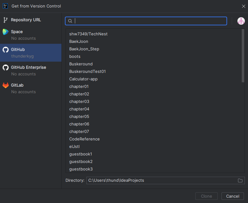 로그인하면 본인의 프로젝트가 나올 것이다, 원하는 프로젝트를 선택하면 된다. 이때 본인이 원하는 로컬 Directory경로를 설정해줄 수 있다.