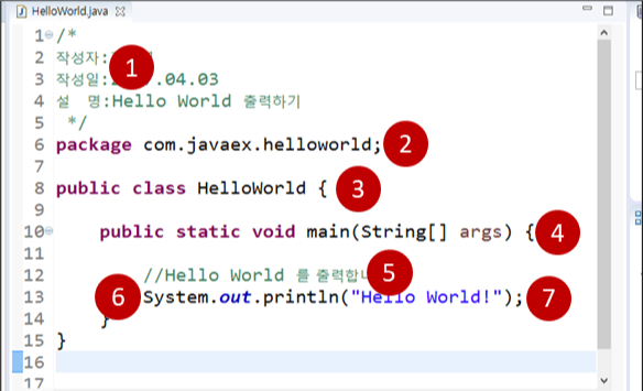 - 클래스명의 첫 글자는 대문자로 작성, 소스코드 파일의 이름과 클래스이름은 동일