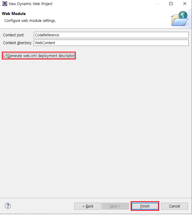 - Generate web.xml deployment descriptor - 체크하면 "Content directory"에 "web.xml"이 자동을 생성된다.