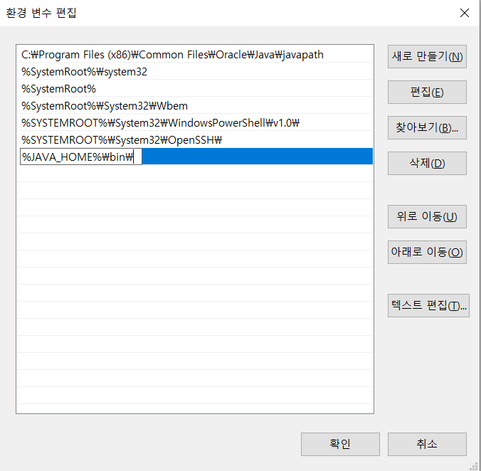 6. 새로 만들기를 선택한 이후에 아래 값을 입력해주자. (%JAVA_HOME%\bin\)