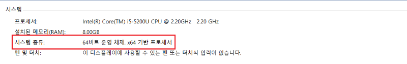 x64/x86의 경우 시스템 종류를 확인해주면 된다